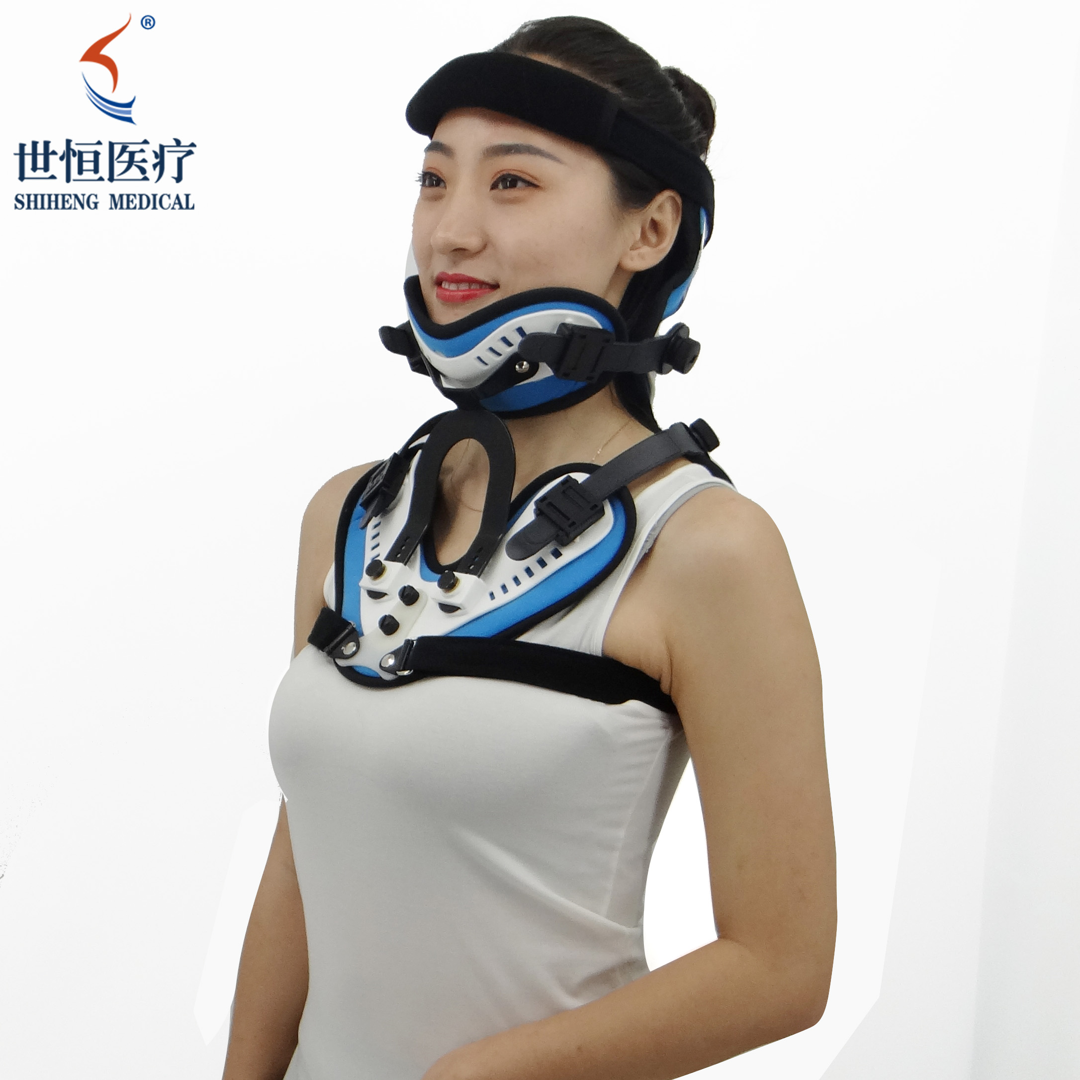 头颈胸支具,是杆式颈椎支具的一种,为胸骨、枕骨、下颌骨固定支具,通过调节颈托与枕托的高度,方便屈伸角度。由绑带固定,方便佩戴。