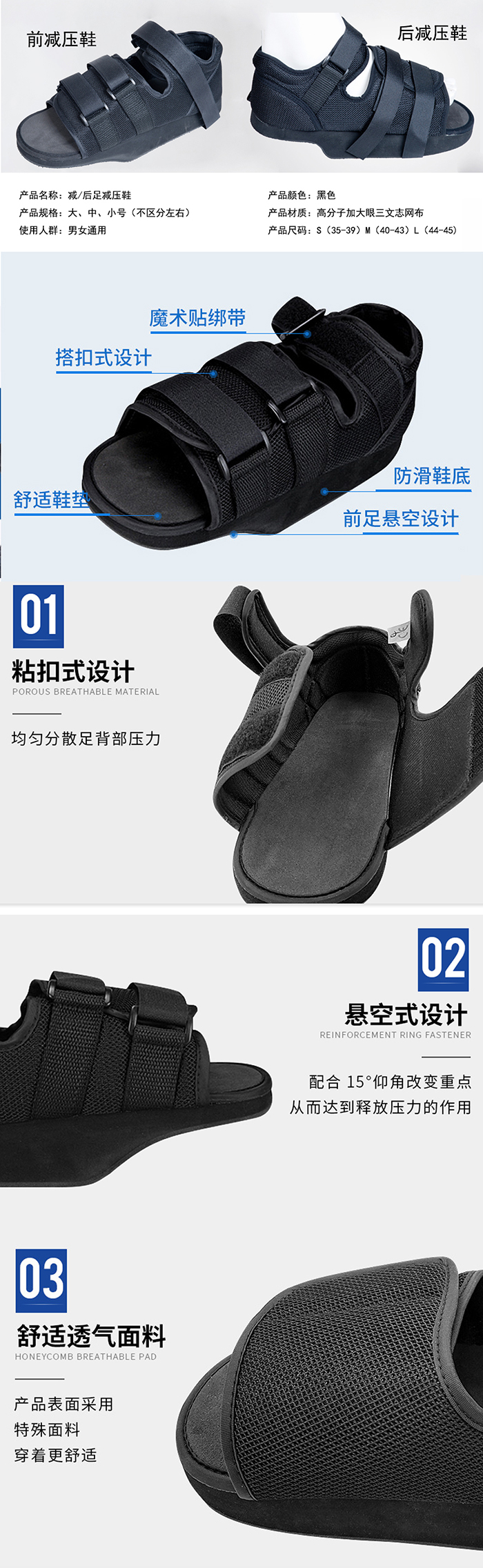 减压鞋优点:搭扣式设计,均均分散足部压力;前臂加宽加长设计;条装鞋底加大足中部抓地力,提供了稳固的保护。