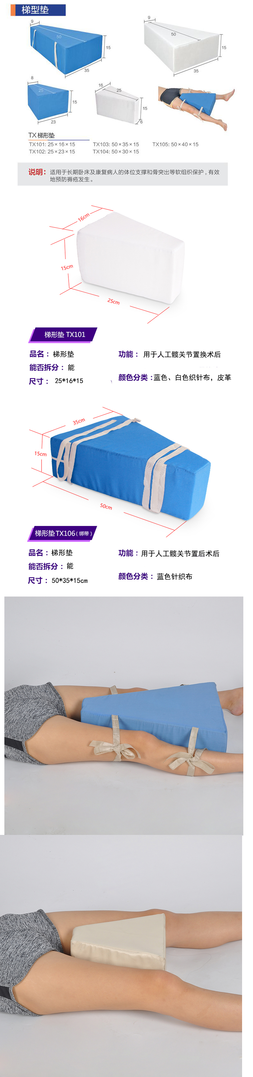 梯形垫是骨科体位垫的一种,适用于长期卧床及康复期病人的体位支撑和突出等软组织保护,有效地预防褥疮发生,可以放置于人工股骨头置换、髋关置换节术后患者两腿之间,防止双腿外旋和内收及关节脱位。