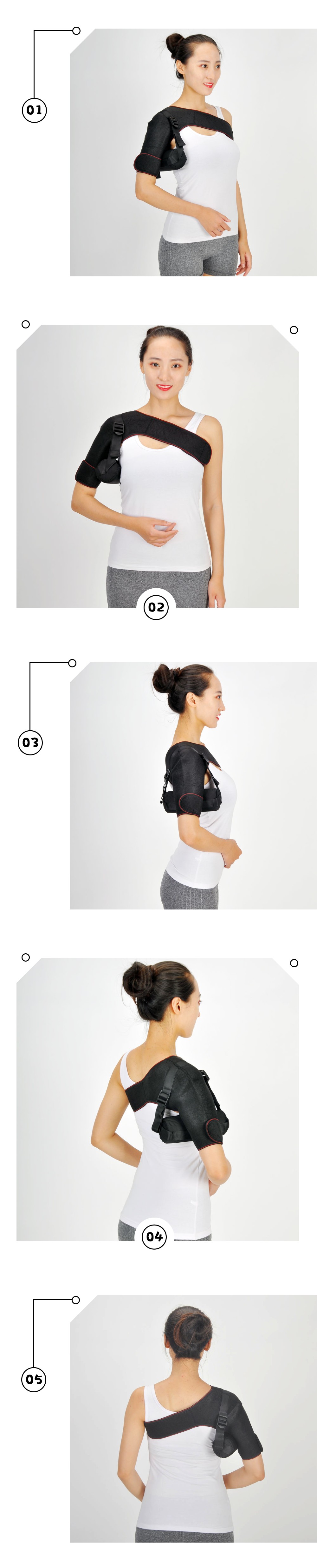 使用方法:将固定带置于上臂,将衬垫收紧,把两个加力带根据情况固定好,上面吊带固定在身体的另一侧。肩部固定带采用自由粘贴方式,方便调节固定强度。