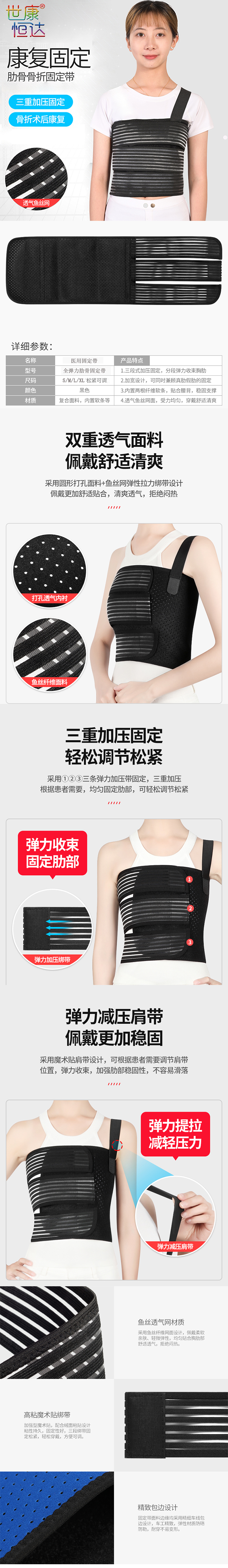2、将肋骨固定带的粘扣粘好,注意是否太紧或太松,太紧会造成呼吸不畅或血液循环不好,太松可能会导致骨折端移位,起不到固定的作用。