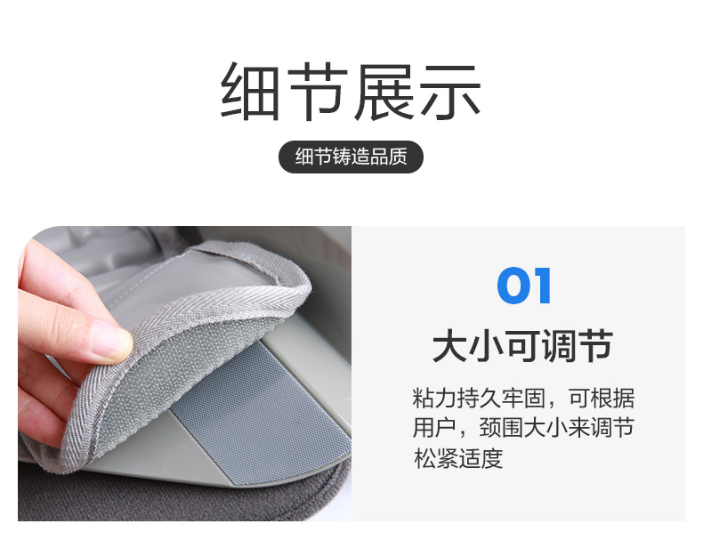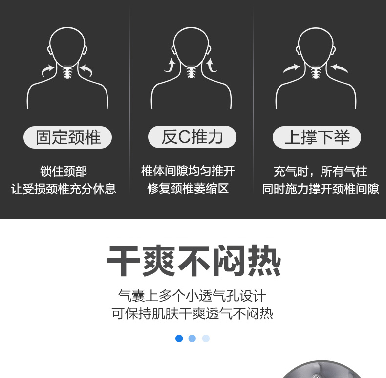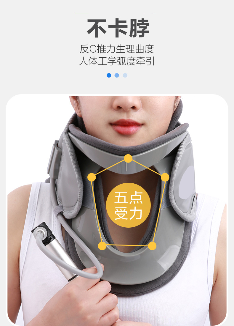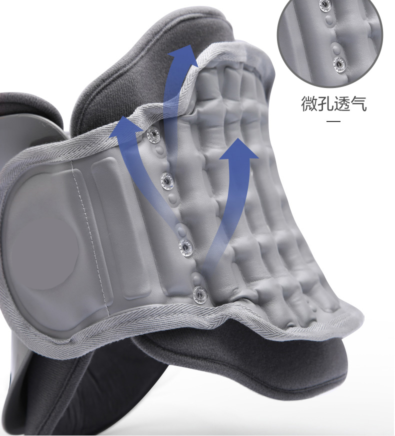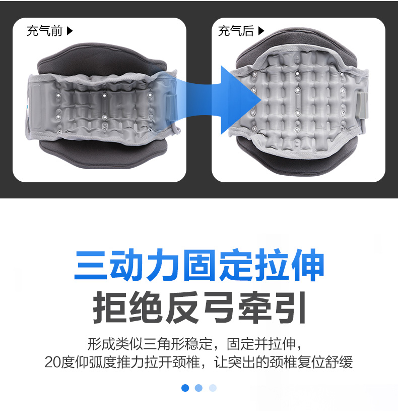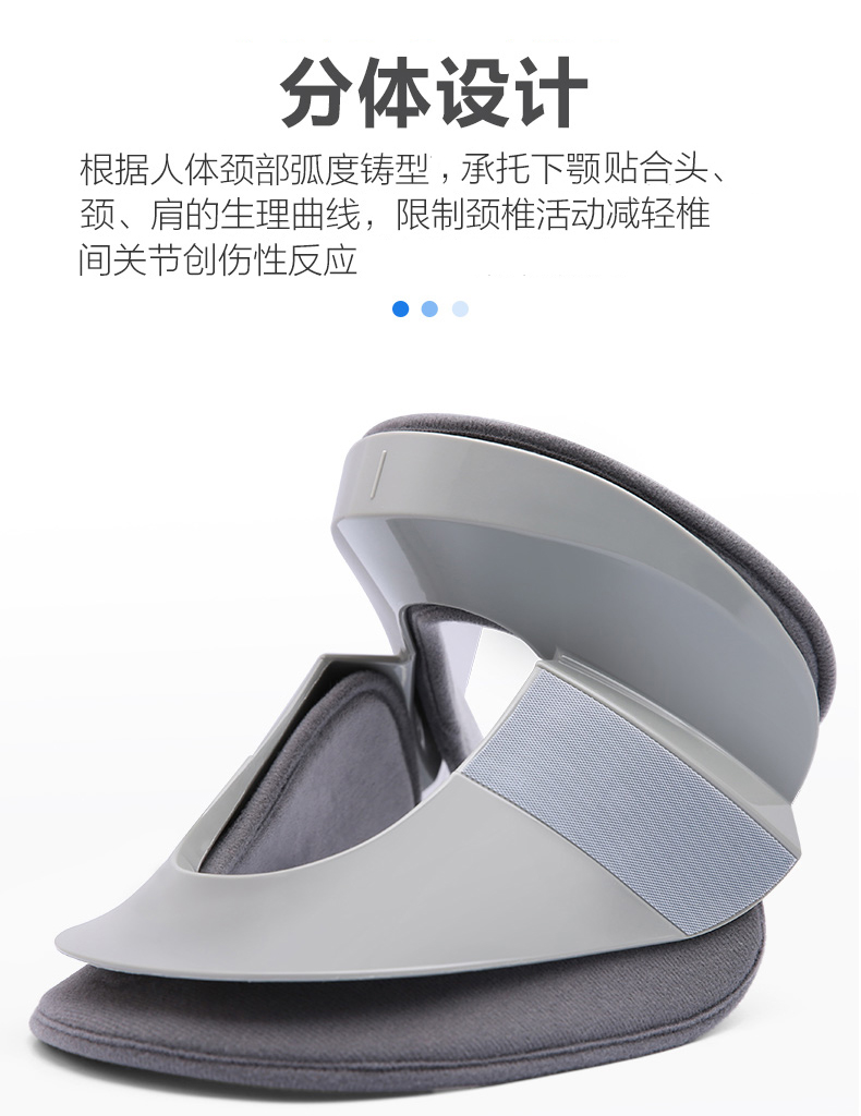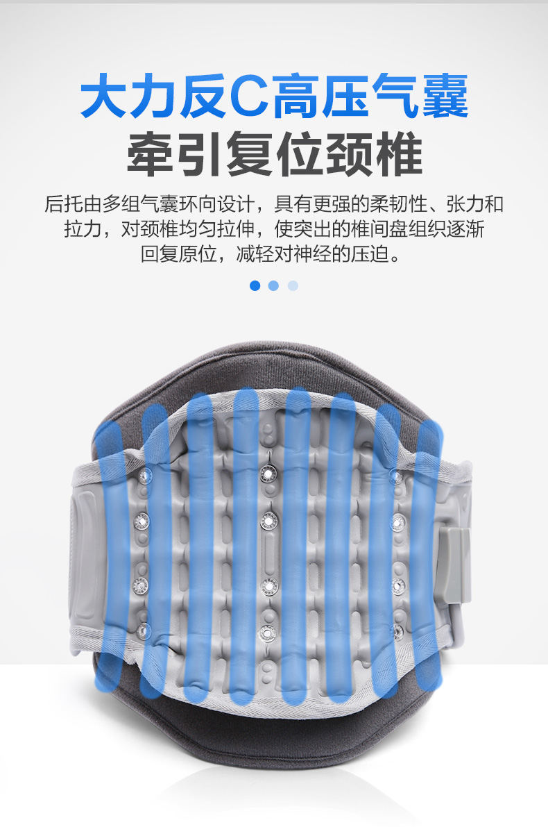 产品特点:颈托后托由多组气囊环向设计,具有柔韧性、张力、和拉力,可对颈椎均匀拉伸。形成类似三角形稳定,固定并拉伸,20度仰弧度推力拉开颈椎。气囊上有多个透气小孔设计,干爽透气不闷热。分体设计根据颈部弧度铸形,承托下颚贴合头颈。粘扣固定可根据颈围大小调节松紧度。