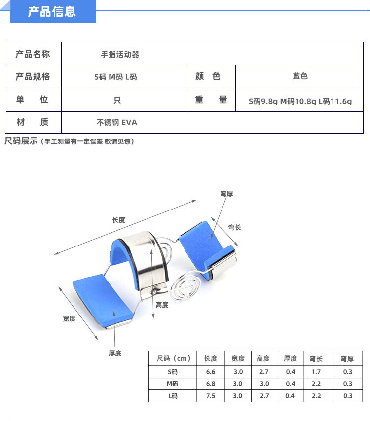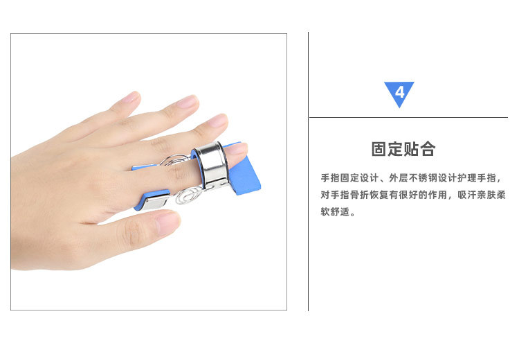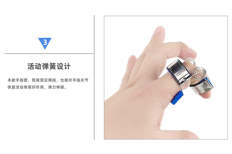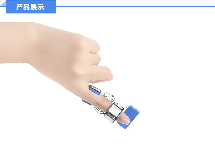 产品描述:采用不锈钢丝弹簧,不锈钢片及柔软的EVA衬垫等材料制成,佩戴方便、舒适。佩戴后依靠弹簧的弹力把手指伸直固定同时,手指用力弯曲又可以克服弹簧力做康复训练。即被动直,主动弯。